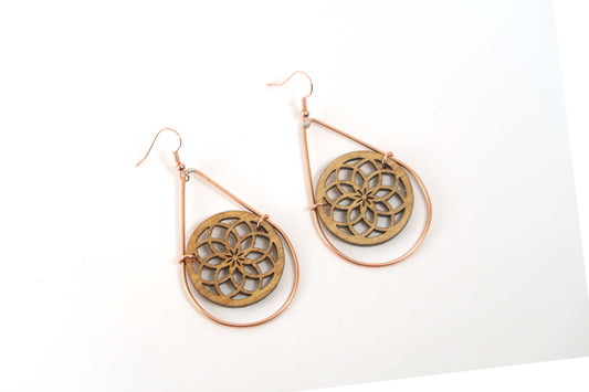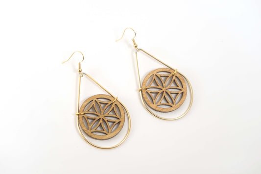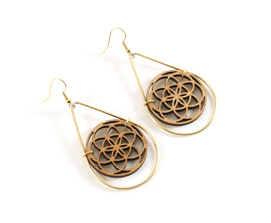 Seed of Life Wooden Teardrop Earrings in Brass Frame