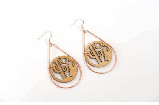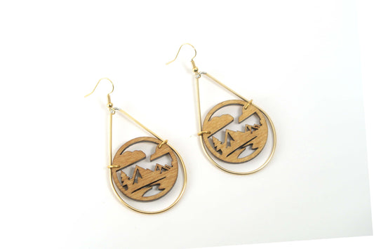 Mountain Range Wooden Teardrop Earrings in Brass Frame