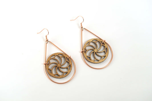 Spiraling Flower Wooden Teardrop Earrings in Brass Frame